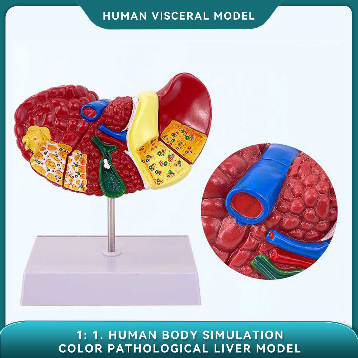 Simulated human liver model with sections of gallbladder, pancreas, spleen, liver, gallbladder, pancreas, liver, gallbladder, pancreas, stomach, liver anatomy, liver and duodenal lesions...
